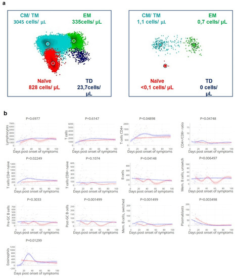 (a). Low density of circulating CD4+ T cell compartment in a patient with delayed viral clearance (right). Representative illustration of CD4+ T cell compartment in the peripheral blood samples of a patient with rapid (left: duration of positive PCR—1 day) or delayed viral clearance (right: duration of positive PCR—29 days). CM = central memory; TM = transitional memory; EM = effector memory; TD = effector, terminally differentiated; data analysis performed with Infinicyt software (Cytognos, Salamanca, Spain), each diagram is a representation of automated population separator (APS). One sample for each of the two patients. (b). Reduced circulating (naïve) CD4+ T cells, post-GC B cells, and memory B cell count over time corresponds with delayed viral clearance. Kinetics of absolute counts of circulating leukocyte subsets (measured as cells/µL) in relation to the time to viral clearance, a selection of subsets based on p-values (see Supplementary Figure S2). Groups with rapid: ≤ 21 days (blue lines/dots) and delayed: > 21 days viral clearance (red lines/dots). Lines indicate non-linear group trends. Spline regression with bootstrap confidence intervals. (c). Reduced CD8+ effector T cell count at day 10–14 corresponds with ICU admission. Mean values at day 10–14 grouped by non-ICU (blue)/ICU (red) patients, and median values per patient. T CD4+ c/tr.m; T cells CD4+ central/transitional memory, T CD4+ eff.m; T cells CD4+ effector memory, td; terminally differentiated, pre-GC; pre germinal center B cells; circulating naïve B cells [32]. n = 41 patients, 128 samples. Mann–Whitney U test.