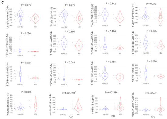 In total 133 blood samples from 102 COVID-19 positive patients were available for flow cytometry analyses. Absolute counts of the main circulating leukocyte subsets (Supplementary Figure S4) were obtained based on an adapted standard protocol for peripheral blood sample processing for flow cytometry measurement (for detailed protocol see www.EuroFlow.org (accessed on 1 January 2020) [25]) using an optimised combination of markers for surface staining (Primary Immunodeficiency Orientation Tube: PIDOT, Cytognos, Salamanca, Spain, https://www.cytognos.com/products/pidot-primary-immunodeficiency-orientation-tube (accessed on 1 January 2022) [26,27]).