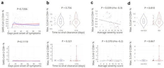 Lower SARS-CoV-2-specific CD4+ T cell counts correspond with higher disease severity. (a). Kinetics of circulating CD4+ and CD8+ T-cells specific to SARS-CoV-2 spike, nucleocapsid, and membrane peptides, in relation to the day of viral clearance. (b). Maximum values grouped by the time to viral clearance: ≤ 21 (blue)/> 21 (red) days. Lines indicate non-linear group trends. Spline regression with bootstrap confidence intervals. (c). Maximum values and average daily severity scores per patient, grouped by the time to viral clearance: ≤ 21 (blue)/> 21 (red) days. (d). Maximum values grouped by non-ICU (blue)/ICU (red) patients. SARS-CoV-2 CD4+ (%) = percentage of CD154+CD137+ out of total CD4+ T cells, SARS-CoV-2 CD8+ (%) = percentage of CD137+IFNg+ out of total CD8+ T cells. S.CoV-2; SARS-CoV-2. n = 34 patients, 130 samples. Mann–Whitney U test.