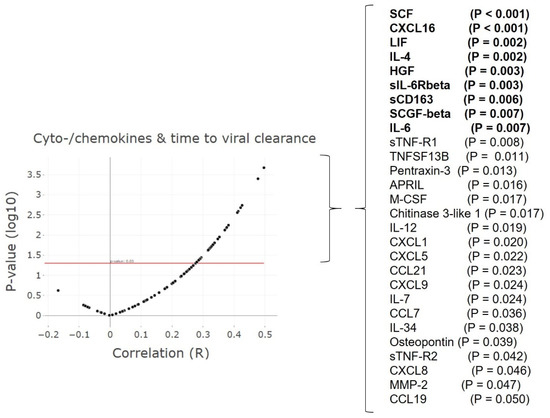 Higher levels of pro-inflammatory cyto/chemokines correspond with delayed viral clearance. Volcano plot: cytokines and chemokines (maximum levels) correlated with the time to viral clearance, a selection based on p-value ≤ 0.05, with R ≥ 0.4 in bold. An overview of all cytokines and chemokines assessed is listed in Supplementary Table S2. n = 51 patients, 321 samples. Spearman’s rank correlation (rho).