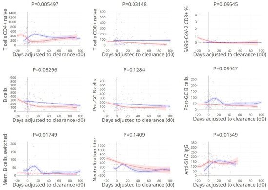 Peak levels of naïve CD4+ T cells, naïve CD8+ T cells, post GC and memory B cells, and anti-spike IgG coincide with rapid viral clearance. Kinetics of humoral and cellular immune parameters adjusted to the timing of viral clearance (day 0). A selection of humoral and cellular parameters was made based on findings described above. Blue: viral clearance ≤ 21 days, red: > 21 days. Lines indicate non-linear group trends. Spline regression with bootstrap confidence intervals.