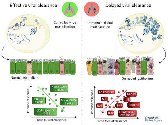 Hypothesis-generated drawing including all immune parameters in this study found to be associated with (delayed) viral clearance. Pre-GC; pre germinal center B cells; circulating naïve B cells [32]. Adapted from “Coronavirus Replication Cycle”, by BioRender.com, accessed 1 January 2022.