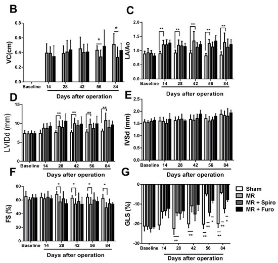 Effect of mineralocorticoid receptor antagonists on the progression of mitral regurgitation (MR) and myocardial dysfunction in a rat model of MR. Heart structure and function were measured by echocardiography at baseline, Day 14 postoperation, Day 28, Day 42, Day 56, and Day 84 post-treatment. (A) Illustrations of echocardiographic imaging in the sham, MR, MR+ spironolactone (Spiro), and MR+ furosemide (Furo) groups. (B) Echocardiographic measurement results for vena contracta (VC), (C) left atrial (LA)/aorta (Ao) size ratio, (D) left ventricular internal dimension at end-diastole (LVIDd), (E) interventricular septal thickness at end-diastole (IVSd), (F) fractional shortening (FS), and (G) global longitudinal strain (GLS). Data are expressed as the mean ± standard deviation (S.D.). * p < 0.05, ** p < 0.01 for differences from each group.