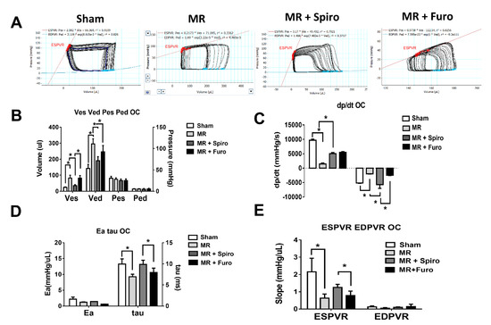 Effects of mineralocorticoid receptor antagonists on cardiac hemodynamics in a rat model of mitral regurgitation (MR). (A) Representative pressure–volume plots in the sham, MR, MR+Spiro, and MR+Furo groups. (B) Comparison of the mean end-systolic volume (Ves), end-diastolic volume (Ved), end-systolic pressure (Pes), and end-diastolic pressure (Ped); (C) maximal velocity of pressure rise (+dP/dt) and fall (−dP/dt); (D) mean arterial elastance (Ea), the time constant of isovolumic pressure decay (tau); and (E) mean slopes of the end-systolic pressure–volume relationship (ESPVR) and end-diastolic pressure–volume relationship (EDPVR) in each group. * p < 0.05 for differences from each group.