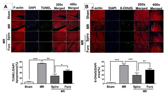 Mineralocorticoid receptor antagonists attenuate suppressed mitral regurgitation (MR)-induced cardiomyocyte apoptosis. (A) Representative heart sections with TUNEL staining for apoptosis detection (green) in 200× and 400× magnificence of scales; scale bars, 100 µm (top panel). Quantification of cardiac apoptosis in the indicated groups of rats (bottom panel). (B) Representative and quantified ROS expressions using hydroxydeoxyguanosine (8OHdG) staining. Data are expressed as the mean ± standard deviation (S.D.). * p < 0.05, ** p < 0.01, and *** p < 0.001 for differences from each group.