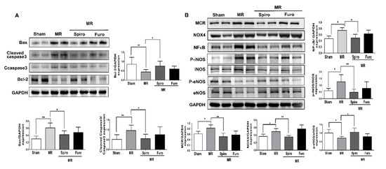 We also measured the level of apoptosis in cardiomyocytes using TUNEL staining. Compared to that of the sham group, the number of apoptotic cardiomyocytes significantly increased in the LV tissue of the MR groups, while pretreatment with Spiro significantly decreased the number of apoptotic cardiomyocytes and was even lower than that in the Furo treatment group (Figure 4A). Further, to measure the expression of ROS, using 8OHdG, a widely used biomarker of oxidative DNA damages, we observed a significant increase in ROS expression in the left ventricle tissue of MR rats, while Spiro significantly suppressed it but Furo treatment did not (Figure 4B). Apoptosis-related proteins, including Bax, cleaved caspase 3, and Bcl-2 in LV tissue were measured by Western blotting. As demonstrated in Figure 5A, compared with the sham groups, Bax and cleaved caspase 3 protein expression were upregulated, while Bcl-2 protein expression was downregulated in the MR groups. Notably, these changes in protein expression were reversed in the Spiro groups. MR-induced oxidative stress contributes to increased production of ROS, resulting in elevated cardiac apoptosis [7,11,12]. Recently, studies have demonstrated that NOX4 is an important source of ROS derived from mineralocorticoid receptors. To study the mechanisms involved in the cell protective effect of Spiro, we found that the protein levels of MCRs and NOX4, NADPH oxidases, were significantly increased in the MR groups, while Spiro treatment suppressed them (Figure 5B). Notably, Spiro also attenuated mitral regurgitation-induced activation of NFκB and iNOS, ROS-associated proteins, and in contrast, augmented eNOS signaling, which is associated with the suppression of apoptosis in cardiomyocytes (Figure 5B). Taken together, in addition to being a diuretic, Spiro improved MR-induced cardiovascular dysfunction. Additionally, the treatment of Spiro was associated with the mitigation of mitral regurgitation-triggered ROS and apoptosis-associated proteins.