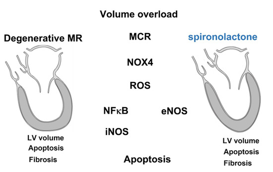Overactivation of the MCRs has been observed in different cardiovascular diseases, including HF. The left ventricular dilatation, cardiac hypertrophy, and development of HF were attenuated, while mineralocorticoid receptor genes were inactivated in mouse models of chronic pressure overload or myocardial infarction (MI). Conversely, the use of Spiro has been found to reduce cardiac oxidative stress and nitrite generation in the setting of diabetes. Likewise, Kobayashi et al. reported that in Dahl salt-sensitive rats with HF, suppressing inducible NO synthase and nuclear factor kappa B (NF-κB), eplerenone stimulates eNOS and improves cardiac function and remodeling. To date, there is increasing evidence for a crucial role of aberrant mineralocorticoid receptor activation in HF with clinical studies showing the beneficial effects of mineralocorticoid receptor blockage. Ayuzawa et al. reported that treatment with eplerenone inhibited mineralocorticoid receptor signaling and Nox4 gene upregulation to improve cardiac hypertrophy and dysfunction caused by pressure overload [25]. Additionally, it has been demonstrated that aldosterone-induced Kv1.5 expression was suppressed by Spiro through attenuating MR-Nox1/2/4-mediated ROS generation in cardiomyocytes [14]. In this study, we also observed that Spiro attenuated MR-induced activation pathways of MCR/NOX4/ROS/iNOS, and in contrast, augmented eNOS signaling. There are some limitations of this study. First, given a correlative analysis, this study could not mechanistically provide the direct mechanism linking MRAs and myocardial dysfunction. In addition, the positive effect of Spiro and its high relevance for the treatment of heart failure over furosemide are well-known [21,22,26]. However, through this experimental model of MR we highlighted new insights of applications of heart failure drugs in mitigating the progression of MR and the possibilities of clinical interest for further studies. Further interventional studies focusing on the MCR/NOX4-associated pathway are necessary. Second, in this two-part study combining a prospective, experimental arm and the other retrospective, clinical arm, we aimed to seek the potentials of clinical applications of Spiro in patients with degenerative MR. Although the main results could be discussed separately, it provides a translational approach regarding the role of MRAs in MR. Most importantly, instead of an observational study, a randomized control study to investigate the effects of ARNI on degenerative MR is crucial in the future. Lastly, although hyperkalemia remains a concern with mineralocorticoid receptor antagonists, third-generation mineralocorticoid receptor antagonists such as finerenone may present a more favorable cardiac-to-renal activity ratio and fewer adverse effects. The ongoing FINEARTS-HF study should provide evidence regarding the effects of finerenone on outcomes in patients with HF. In this study, we addressed evidence in terms of the potential benefits of Spiro use in mitigating mitral regurgitation-induced myocardial fibrosis and dysfunction. Our findings provide alternative options for pharmacological intervention in treating patients with mitral regurgitation-induced HF.