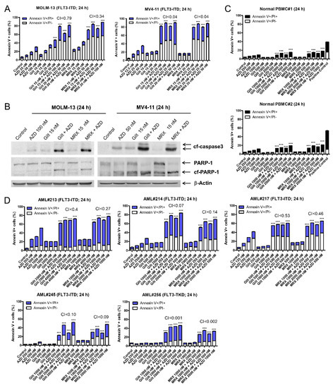To determine whether AZD5991 synergizes with FLT3 inhibition, FLT3-ITD positive AML cell lines MOLM-13 and MV4-11 were treated with the vehicle control, AZD5991, gilteritinib, or MRX-2843, alone or in combination, for 24 h. AZD5991 and gilteritinib treatment, as well as the AZD5991 and MRX-2843 treatment, resulted in significantly higher levels of cell death compared to the individual drug treatments and the vehicle control, as determined by the annexin V-FITC/PI staining and flow cytometry analyses. The CI values (CI < 0.79 and 0.04 for MOLM-13 and MV4-11, respectively) demonstrate that AZD5991 and gilteritinib or MRX-2843 synergize in inducing cell death in the FLT3-ITD AML cell lines (Figure 1A). The significant increase in annexin V positivity was accompanied by a substantial increase in the cleavage of caspase 3 and PARP (Figure 1B), demonstrating the induction of apoptosis. In contrast, the normal PBMCs treated with AZD5991 and gilteritinib or MRX-2843 at much higher concentrations (>10-fold) showed less than 20% annexin V positivity (Figure 1C). In addition, AZD5991 synergized with gilteritinib and MRX-2843 in the FLT3-mutated primary AML patient samples (Figure 1D).