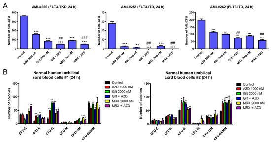 AZD5991 alone and in combination with gilteritinib or MRX-2843 significantly reduces colony-forming capacity of FLT3-mutated AML progenitor cells. (A,B) Primary AML patient samples (panel (A)) and normal human umbilical cord blood cells (panel (B)) were treated with AZD5991 (AZD), gilteritinib (gilt), or MRX-2843 (MRX), alone or in combination, for 24 h, and then plated in methylcellulose. The number of leukemic colonies (AML-CFUs), erythroid, and myeloid colonies were counted 10–14 days later. Data are presented as mean ± SEM. * indicates p < 0.05, ** indicates p < 0.01, and *** indicates p < 0.001 compared to control. ## indicates p < 0.01 and ### indicates p < 0.001 compared to single-drug treatments. Technical triplicates were performed.