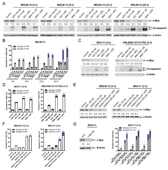 To begin to determine the mechanism of action of the combinations, we performed time course experiments. Western blot analysis of MOLM-13 cells revealed a downregulation of c-Myc protein by gilteritinib and MRX-2843 single treatments as early as 3 h (Figure 3A), which was prior to the significant induction of apoptosis by these single-drug treatments (Figure 3B). Gilteritinib and MRX-2843’s downregulation of c-Myc was maintained when AZD5991 was added and was accompanied by a significant induction of apoptosis compared to the single-drug treatment as early as 3 h. Similar results were obtained when MV4-11 and primary AML patient AML#262 cells were treated for 3 h (Figure 3C,D). The c-Myc inhibitor 10058-F4 downregulated c-Myc and enhanced the apoptosis induced by AZD5991 in both the MV4-11 and MOLM-13 cells (Figure 3E,F). Further, c-Myc knockdown significantly enhanced apoptosis induced by AZD5991, gilteritinib, and MRX-2843, alone and in combination, in the MV4-11 cells (Figure 3G). These results demonstrate that c-Myc plays an important role in the synergistic antileukemic activity of AZD5991 and gilteritinib or MRX-2843 in AML cells.