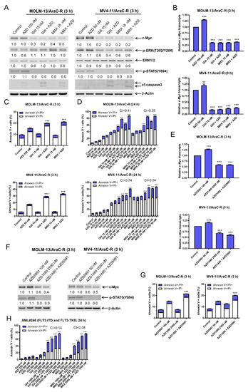 Gilteritinib is FDA-approved for the treatment of relapsed/refractory patients with FLT3-mutated AML. Thus, it is important to test if the combination of AZD5991 and FLT3 inhibition is effective against chemotherapy-resistant AML cells. MOLM-13 and MV4-11 cells with acquired AraC resistance (designated MOLM-13/AraC-R and MV4-11-R, respectively) were previously generated and demonstrate increased levels of c-Myc when compared to the parental cells [14,15]. Consistent with the parental cells, the AraC-resistant cells also showed a downregulation of c-Myc and p-STAT5 after a 3 h treatment with gilteritinib or MRX-2843 alone or in combination with AZD5991 (Figure 6A). The downregulation of p-ERK was detected in the MV4-11/AraC-R cells after the treatment with MRX-2843 or gilteritinib alone or in combination with AZD5991, but not in the MOLM-13/AraC-R cells. The downregulation of the c-Myc protein by gilteritinib or MRX-2843 both alone and in combination with AZD5991 was accompanied by significantly decreased c-Myc transcript levels (Figure 6B). Consistent with the parental cells, AZD5991 treatment alone resulted in a significant increase in c-Myc transcript levels. AZD5991 treatment significantly enhanced gilteritinib and MRX-2843-induced apoptosis at this early treatment time (Figure 6C). The treatment with AZD5991 combined with gilteritinib or MRX-2843 for 24 h resulted in synergistic induction of apoptosis (Figure 6D). The treatment with the JAK2 inhibitor, AZD1480, alone or combined with AZD5991 significantly decreased c-Myc transcript levels in the AraC-R cells (Figure 6E), which was accompanied by substantially reduced c-Myc protein levels (Figure 6F). Consistent with the parental cells, the AZD1480 (JAK1/2 inhibitor) and AZD5991 (Mcl-1 inhibitor) treatment significantly induced apoptosis in the AraC-R cells after 3 h of treatment (Figure 6G). The combination of AZD5991 and gilterinib or MRX-2843 also synergistically induced apoptosis in the primary AML cells derived from a patient with FLT3-ITD and -TKD AML who failed to achieve remission after induction 3 chemotherapy (Figure 6H). These results demonstrate that the combination of Mcl-1 inhibition and FLT3 inhibition shows promising antileukemic activities against AML cells resistant to chemotherapy, and that the suppression of c-Myc through the JAK2/STAT5 pathway by FLT3 inhibition plays an important role in the mechanism of action of combined Mcl-1 inhibition with AZD5991 and FLT3 inhibition with gilteritinib or MRX-2843.