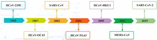 The name “coronavirus (CoVs),” coined in 1968, is derived from the “corona”-like morphology observed for these viruses in the electron microscope [44]. To date, seven CoVs have been reported to infect humans (Figure 1), of which HCoV-229E and HCoV-OC43 have been shown to cause common cold-like illnesses. They are also the first coronavirus found to infect humans [45,46]. Severe acute respiratory syndrome coronavirus (SARS-CoV), a Beta-coronavirus, emerged in late 2002 in Guangdong province, China, and spread rapidly to other countries and continents [47]. The species of bats are a natural host of this coronavirus [48]. Meanwhile, SARS-CoV, which causes severe acute respiratory syndrome (SARS), has introduced a new chapter in the serious human disease caused by coronavirus [44]. Subsequently, reports of two new human coronaviruses, (HCoV-NL63 in 2004 [49] and HCoV-HKU1 in 2005 [50]) associated with respiratory disease have been published. Several years later, the Middle East respiratory syndrome coronavirus (MERS-CoV) emerged in 2012 and caused outbreaks in Saudi Arabia and South Korea [51]. Similar to SARS-CoV, MERS-CoV originated in bats, but dromedary camels were identified as intermediate hosts [52]. Taken together, the repeated occurrence of coronaviruses in humans and the detection of numerous coronaviruses in bats suggest that future zoonotic transmission events are likely to continue [53]. Indeed, 2019 saw the introduction of a novel zoonotic coronavirus in Hubei Province, China, which appears to be a close relative of the SARS-CoV and has been named SARS-CoV-2. It is a non-segmented, enveloped, positive-sense single-stranded RNA (ssRNA) virus that belongs to the Beta-coronavirus genus of the Coronaviridae family and can infect both humans and animals [8]. The disease caused by this virus was named coronavirus disease 2019 (COVID-19) [1]. The virus has rapidly spread worldwide, leading the WHO to declare COVID-19 a pandemic in March 2020 [54].