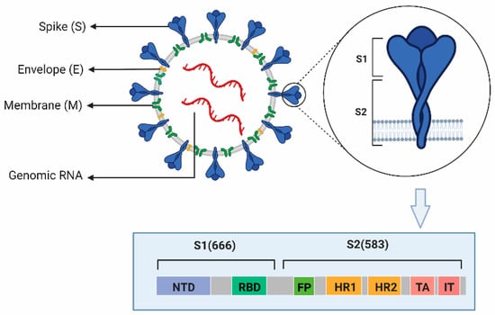 The particles of coronaviruses are spherical with three viral proteins anchored in the envelope: (1) the triple-spanning membrane (M) protein, (2) the envelope (E) protein, and (3) the spike (S) protein, which forms the characteristic trimeric spikes [23,24,55]. S consists of two functional subunits responsible for binding to the host cell receptor (S1 subunit) and fusion of the viral and cellular membranes (S2 subunit), which contain 666 and 583 amino acid residues, respectively (Figure 2). In the case of several avian and mammalian coronaviruses, S is cleaved by Furin or a related protease into the S1 and S2 subunit. Region S1 contains NTD and receptor-binding domain (RBD). SARS-CoV-2 and other human coronaviruses, SARS-CoV and HCoV-NL63, use as their receptor a cell-surface zinc peptidase, angiotensin-converting enzyme 2 (ACE2) [12,56]. Compared with SAR-CoV, the receptor-binding domain (RBD) of SARS-CoV-2 binds to the ACE2receptor with higher affinity and stability [57]. The binding of the receptor-binding motif (RBM) within the RBD to ACE2 mediates membrane fusion and viral entry. It is the critical determinant of viral host range and tropism [54]. Mutations within both the RBDs of S1 and S2 have been shown to influence pathogenesis [53,58]. Region S2 contains two heptad repeat regions (HR1 and HR2) involved in peptide synthesis in addition to a fusion peptide (FP), transmembrane anchor (TA), and intracellular tail (IT) associated with fusion activity [58]. Therefore, the viral S protein and the way that the virus uses the S protein to enter the host cells are the first targets for vaccine development and overcoming COVID-19.