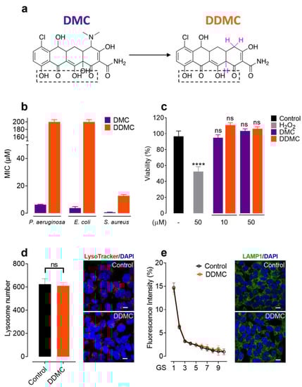 DDMC and DMC were evaluated for their antimicrobial activities against both Gram-negative (Pseudomonas aeruginosa PA01 and Escherichia coli ATCC 25922) and Gram-positive bacteria (Staphylococcus aureus ATCC 25923). DMC exhibited the most pronounced antibacterial activity against these bacteria, with minimum inhibitory concentrations (MICs) of 6.25 μM, 3.125 μM, and 0.4 μM, respectively (Figure 1b). As expected, with the removal of the DMA group, DDMC presented only residual antibiotic activities against Gram-negative bacteria while showing a 30-fold reduction in antibiotic activity against Gram-positive bacteria (MIC of 12.5 µM), with respect to that obtained for other TCs [27] (Figure 1b).