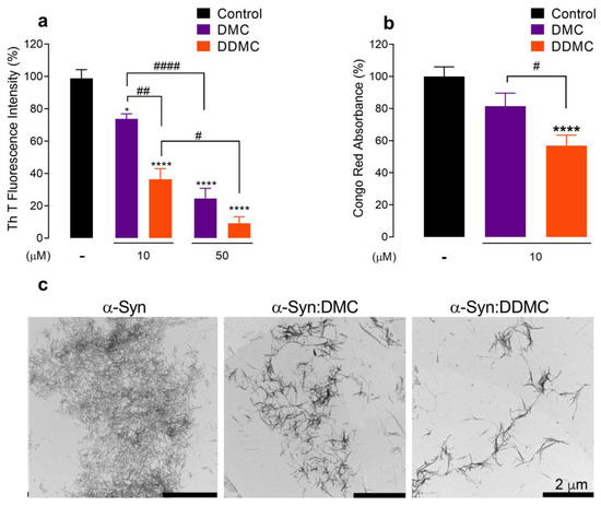 In the presence of 50 μM DMC, the ThT fluorescence intensity—as expected—decreased by around 75% (p < 0.0001) compared to the control, while the effect at 10 μM was significantly less pronounced (26%, p = 0.0148) (Figure 2a). Surprisingly, DDMC was more effective than its precursor; at 50 μM, the ThT signal was almost completely abolished (p < 0.0001); moreover, at 10 μM, DDMC remained capable of inhibiting α-Syn cross-β formation, reaching a significant ThT signal reduction of 65% (p < 0.0001) (Figure 2a); these data strongly suggest that the chemical modifications introduced to DMC improved the ability of DDMC to interfere with α-Syn amyloid-like aggregation.
