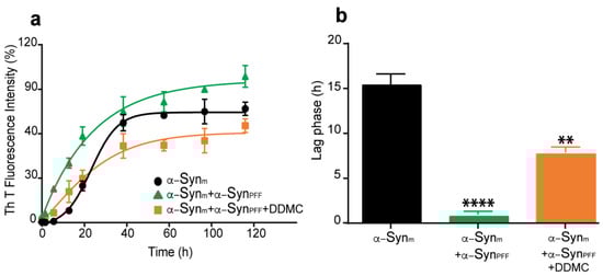 According to the nucleation/polymerization model, preformed α-Syn fibrillar species (α-SynPFF) have the ability to induce and accelerate the aggregation of the soluble monomeric protein and could be considered as seeds in this reaction [38]. To assess the ability of DDMC to inhibit the seeding competence of α-SynPFF, we compared the aggregation kinetics of monomeric α-Syn (α-Synm) to α-Synm seeded with α-SynPFF in the absence (α-Synm+α-SynPFF) or presence of 10 µM DDMC (α-Synm+α-SynPFF+DDMC). As shown in Figure 3a, the α-Syn amyloid-like fibril formation kinetics displayed a typical sigmoidal curve. In fact, we observed a 15 h lag phase followed by exponential growth that finally reached a plateau at 48 h, as was previously described by González-Lizárraga and colleagues [10]. The addition of α-SynPFF to the α-Synm solution accelerated the aggregation process, as revealed by the hyperbolic kinetics that was fit to a hyperbolic function (Figure 3a). Surprisingly, the presence of DDMC at the beginning of the aggregation process caused a significant decrease in ThT fluorescent intensity at all time points evaluated (Figure 3a), and a 6 h lag phase was observed (Figure 3b).