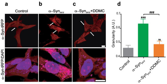 Effect of DDMC on α-SynPFF-induced seeding of cytoplasmic α-Syn. (a–c) SH-SY5Y transgenic cell line (Innoprot #P30707-02) expressing α-Syn-tRFP treated with α-SynPFF or α-SynPFF+DDMC (10 µM). The lower panel corresponds to an enlargement of the region indicated with the white arrows together with DAPI counterstaining. (d) Granularity was quantified using CellProfiler 4.2.1. Statistical significance is indicated as: *** p < 0.001 vs. Control; ### p < 0.01 vs. α-SynPFF; ns not significant vs. Control.