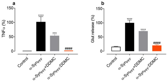 The inflammatory potential of α-Syn depends on the state of protein aggregation. As was previously shown by our group, aggregated species such as α-SynPFF have strong inflammogenic properties in microglial cells [45]. These aggregates trigger the release of inflammatory factors, such as tumor necrosis factor α (TNFα) [45] and glutamate (Glut) [11]. In order to evaluate the ability of DDMC to interfere with the release of proinflammatory factors, we treated primary microglial cells with α-SynPFF. After 24 h of treatment, tenfold and eightfold increases in TNFα and Glut release, respectively, were observed (Figure 5a,b). In the presence of DDMC, (α-SPFF+DDMC) a significant reduction the release of TNFα and Glut compared to the absence of the novel TC was observed. In addition, we also tested the inflammogenic activity of the remaining fibrils formed in the presence of DDMC, shown in Figure 2c (α-SynPFF:DDMC), by measuring TNFα and Glut release in microglia cells. In order to exclude any effects due to the DDMC itself in the α-SynPFF:DDMC samples, the TC was removed by dialysis before treatment (see Materials and Methods). As expected, α-SynPFF strongly stimulated the release of TNFα (Figure 5a) and Glut (Figure 5b) after 24 h compared to the control condition (p < 0.0001). However, when the cultures were exposed to α-SynPFF:DDMC (fibrils formed in the presence of DDMC but with no residual DDMC), the release of TNFα and Glut was significantly decreased compared to α-SynPFF, reaching levels comparable to the control condition.