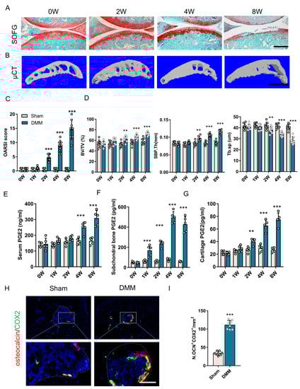 PGE2 level is highly related to joint degeneration in the DMM model. (A) Safranin O/Fast green (SOFG) staining of the medial compartment of mouse tibial subchondral bone (sagittal view) at zero, two, four, and eight weeks following DMM surgery. Scale bar: 200 μm. (B) Three-dimensional microcomputed tomography (μCT) images of the medial compartment of the tibial subchondral bone (sagittal view). Scale bar: 500 μm. (C) Osteoarthritis Research Society International (OARSI) scores. n = 8 mice per group. (D) Quantitative analysis of the structural parameters of subchondral bone: bone fraction (BV/TV), trabecular bone separation (Tb.sp), and subchondral bone plate thickness (SBP.Th). n = 8 mice per group. (E–G) ELISA analysis of PGE2 concentrations in the serum (E), subchondral bone (F), and articular cartilage (G) of mice following DMM or sham surgery. n = 5 mice per group. (H,I) Representative double immunofluorescent images (H) and quantitative analysis (I) of osteocalcin (red) and COX-2 (green) in subchondral bone from DMM or sham mice 4 weeks after surgery. Scale bar: 30 μm. n = 8 mice per group. ** p < 0.01 and *** p < 0.001, means non-significant.
