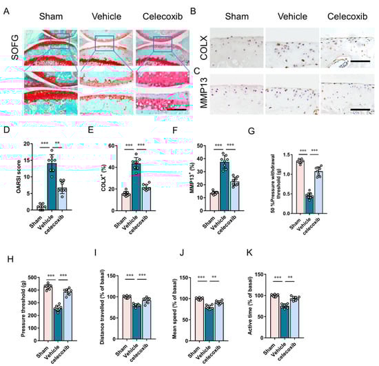 SOFG staining and the OARSI score demonstrated that celecoxib significantly attenuated articular cartilage degeneration in DMM mice (Figure 3A,D). Following immunostaining by type X collagen (COL X+) and matrix metalloproteinase 13 (MMP13+), the effect of celecoxib on the chondrocyte degeneration of articular cartilage was assessed (Figure 3B,C). Percentages of COL X+ and MMP13+ chondrocytes in DMM mice were more than twice those in the sham controls, and celecoxib dramatically reduced the magnitude of increase (Figure 3E,F), which indicates that inhibiting the increase in PGE2 attenuates articular cartilage and chondrocyte degeneration in osteoarthritis.