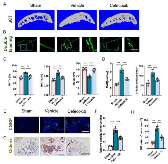 Aberrant subchondral bone remodeling has been proven to induce osteoarthritis pain and joint degeneration in osteoarthritis [10]. To validate the effect and cellular mechanism of PGE2 on subchondral bone, the effect of COX-2 inhibitor on the remodeling status of subchondral bone was explored. Celecoxib prevented aberrant subchondral bone formation, indicated by a decrease in BV/TV in celecoxib-treated DMM mice (Figure 4A,C). Calcein double labeling demonstrated dramatically increased mineral apposition rate and bone formation rate in vehicle-treated DMM mice, which indicates an increased remodeling level and the formation of subchondral bone in DMM subchondral bone. These effects were abrogated by celecoxib treatment (Figure 4B,D). Improvement to the subchondral bone microarchitecture following DMM surgery with celecoxib was demonstrated by the maintenance of SBP.Th, and volume increase in Tb.Sp (Figure 4A,C).