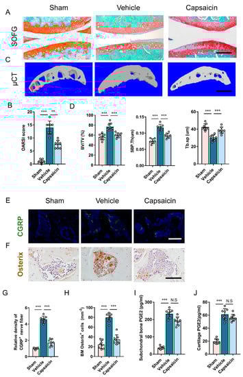 To examine whether sensory nerves mediated PGE2 effects on subchondral bone remodeling, capsaicin was injected to eliminate sensory innervation systemically. As validated by previous research [23], the efficacy of capsaicin-induced sensory denervation is comparable to genetic mice in that TrkA was specifically knocked out from Advillin-positive sensory neurons. The proteoglycan loss of articular cartilage was attenuated by capsaicin following DMM surgery, which is consistent with the OARSI score (Figure 5A,B). Similar to celecoxib application, the microarchitecture of subchondral bone following DMM surgery was improved with the systemic application of capsaicin, as demonstrated by μCT analysis (Figure 5C,D).