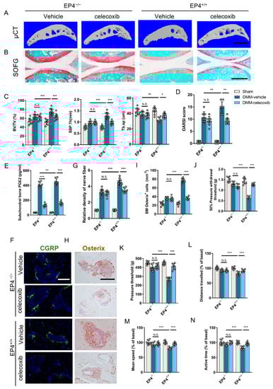 The pain-related phenotype was further evaluated using a behavior test. EP4−/− mice and celecoxib-treated mice showed an improvement in mechanical hyperalgesia, indicated by 50% pressure withdrawal threshold and pressure threshold (Figure 6J,K), compared to the vehicle-treated EP4+/+ DMM mice. The vehicle-treated EP4+/+ DMM mice exhibited a loss of spontaneous activities, while the EP4−/− mice and celecoxib-treated mice showed an improvement (Figure 6L–N). These results suggest that PGE2 in subchondral bone induces altered subchondral bone architecture and formation, as well as pain that is dependent on sensory nerves.