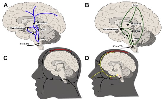 Schematic representation of ascending and descending mechanisms involved in the pathophysiology of migraine, interaction between peripheral and central nervous systems and the trigeminal autonomic reflex. (A) Ascending mechanisms; (B) Descending mechanisms; (C) Connection of dural, cervical and trigeminal inputs in the trigeminocervical complex; (D) Potential interfaces between trigeminal and parasympathetic arms of the trigeminal autonomic reflex. Cervical dermatomes (C1, C2); dorsal root ganglia (DRG); locus coeruleus (LC); periaqueductal gray (PAG); sphenopalatine ganglion (SPG); trigeminal ganglion (TG); trigeminocervical complex (TCC) rostral ventromedial medulla (RVM); ophthalmic, maxillary, and mandibular dermatomes of the trigeminal nerve (V1, V2, V3, respectively). Reproduced from Goadsby and Holland 2019 with permission.