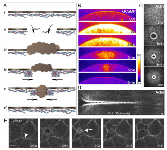 - Benink, H.A.; Bement, W.M. Concentric zones of active RhoA and Cdc42 around single cell wounds. J. Cell Biol. 2005, 168, 429–439. [Google Scholar] [CrossRef]
