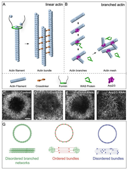 - Michelot, A.; Drubin, D.G. Building Distinct Actin Filament Networks in a Common Cytoplasm. Curr. Biol. 2011, 21, R560–R569. [Google Scholar] [CrossRef]