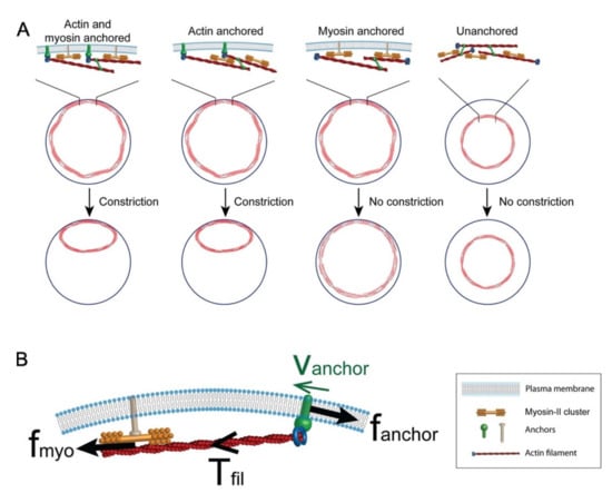 Model of cytokinetic ring attachment to the plasma membrane. (A) Simulation of cytokinetic rings showing that anchoring of actin to the plasma membrane is required for ring constriction. (B) Anchoring is important to maintain myosin-generated tension in the actin filament as depicted by the force diagram. Used with permission from Wang & O’Shaughnessy (2019), Mol. Biol. Cell 30(16): 2053–2064. doi: 10.1091/mbc.E19-03-017 [91]; permission conveyed through Copyright Clearance Center, Inc.