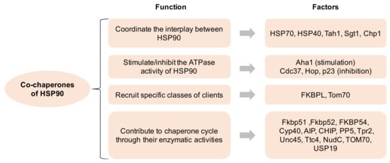 Over 20 co-chaperones of HSP90 have been documented in eukaryotic cells, which modulate the molecular functions of HSP90 in four major ways: (1) coordinate the interplay between HSP90 and other chaperone systems, such as HSP70; (2) stimulate or inhibit the ATPase activity of HSP90, i.e., AHA1 for stimulation and CDC37 for inhibition; (3) recruit specific classes of clients to HSP90; (4) contribute to various aspects of the chaperone cycle through their enzymatic activities (Figure 1). The co-chaperones containing the TPR domain (i.e., HOP) facilitate the cooperative and successive action of the HSP90-HSP70-HSP40 complex to achieve the maturation of client proteins. Separately, the co-chaperones that inhibit the ATPase activity are more likely to be involved in client loading or the formation of mature HSP90 complexes, whereas those that enhance the ATPase activity are regarded as activators of the HSP90 conformational cycle [1].