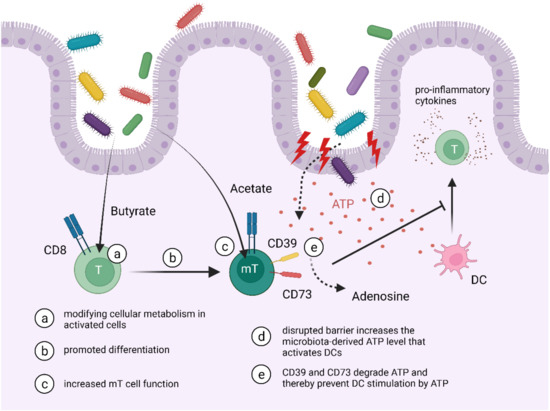Impact of microbiota on mT cells. The presence of microbiota is essential for the CD8+ T cell to mT cell transition. SCFAs like acetate and butyrate contribute to mT cell differentiation and can enhance their memory property. The co-expression of CD39 and CD73 on gut resident mT cells can induce the degradation of ATP released by mucosa infiltrating bacteria. It might therefore attenuate the activation of DCs and possibly reduce pro-inflammatory responses.
