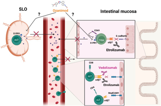 Aside from the antibody-based therapeutical Vedolizumab and Etrolizumab, an oral applicable drug called Ozanimod is of interest in the treatment of not only multiple sclerosis but also IBD. It is a sphingosine 1-phosphate receptor modulator targeting the receptor subtypes 1 and 5 with a high affinity, reducing immune cell infiltration by preventing lymphocyte egress from SLOs [51,110]. Phase 2 and 3 studies provided evidence for clinical improvements upon the treatment with Ozanimod as treated UC patients demonstrated a higher rate of remission and higher clinical response compared to placebo groups [111,112]. Moreover, CD patients receiving the drug for 12 weeks demonstrated better endoscopic, histological, and clinical disease outcomes [113]. Even though those studies were not linked to mT, given their phenotypical characteristics and properties in interacting with S1PRs, it offers new possibilities for future research approaches to further elucidate the roles and impacts of mT in IBD (see Figure 2).