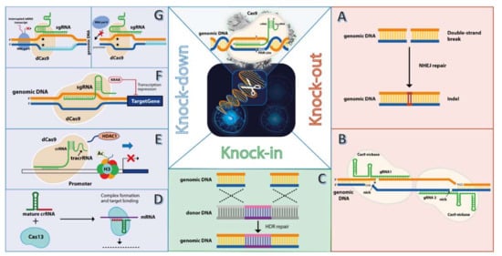 The clustered regularly interspaced palindromic repeats or simply CRISPR are genetic structures first discovered in 1987 in the Escherichia coli genome [15] and later in other bacteria and archaea genomes as well [16,17]. Their function remained unknown until 2005, when a glimpse came from the observation that the spacer sequences between the repeats were homologous to sequences found in the genome of bacteriophages, archaeal viruses, and plasmids. If such matching sequences exist, the invading exogenous genetic material is not able to infect bacterial cells, suggesting their role as a prokaryotic defense mechanism. Adjacent to the CRISPR locus, CRISPR-associated (Cas) genes were also discovered and characterized as encoding sequences for nucleases that recognize a short stretch of 2–5 nucleotides, named protospacer adjacent motif (PAM) in the invading genome, which carry sequences with homology in the spacer sequences of CRISPR array locus [17,18,19]. This array locus encodes two types of RNA sequences, a CRISPR RNA (crRNA) that contains the variable spacer sequences and a trans-activating crRNA (tracrRNA), which together with the Cas nuclease constitutes the effector ribonucleoprotein (RNP) complex. Upon PAM binding, cleavage of the invading phage genome occurs, resulting in a double-strand break (DSB), thus interfering with the expression and multiplication of the phage. The cleavage is mediated by two domains of the Cas nuclease, the HNH domain which cleaves the target strand, and the RuvC domain which is responsible for the cleavage of the opposite strand. Class II CRISPR systems gained particular interest due to their low level of complexity [20]. In 2012, the crRNA and tracrRNA were fused into a chimeric single guide RNA (sgRNA or just gRNA) thus simplifying the system even further [12]. This study showed that Cas9 and the new chimeric crRNA/tracrRNA can cut virtually any DNA molecule in a test tube at a predetermined site, an observation that was granted in 2020 with the Nobel prize in chemistry to Emmanuel Charpentier and Jennifer A. Doudna [21]. By optimizing Cas9 for human codons and adding nuclear localization signals to it, CRISPR/Cas9 was first used in human and mouse cells in 2013 [22,23]. Since then, CRISPR/Cas9 has been readily accepted as a new versatile tool for gene editing, as it can be easily re-programmed by only modifying the crRNA sequence while leaving the remaining components, tracrRNA, and Cas nuclease, unchanged. As opposed to other genome engineering tools, namely the zinc finger nucleases (ZFNs) [24] and transcription activator-like effector nucleases (TALENs) meganucleases [25], CRISPR/Cas9 avoids the more intricate field of protein engineering which makes it cost-effective and ready to use. In mammalian cells, including human cells, upon Cas9 PAM binding and cleavage, the DSBs are repaired by non-homologous end joining (NHEJ), by which short insertions or deletions (indels) are generated in the targeted locus. This event can lead to a reading frame shift and impaired expression of the edited genomic locus [12,22].