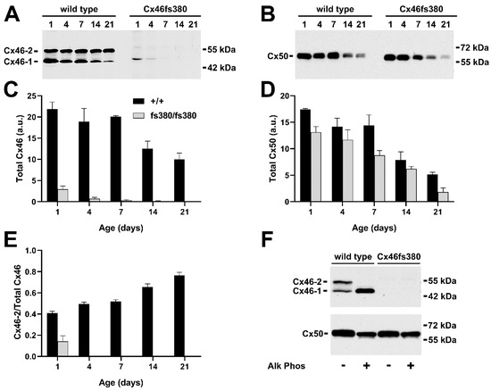We used immunoblotting to determine the electrophoretic migration and abundance of both Cx46 and Cx50 in homogenates prepared from the lenses of homozygous Cx46fs380 mice and their wild-type counterparts at different ages between 1 and 21 days after birth.