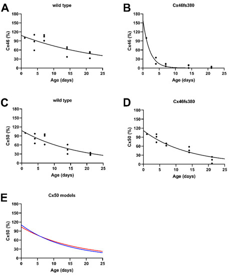 3.3. Exponential Decay of Cx46 and Cx50 Levels in Lenses of Wild-Type and Cx46fs380 Mice