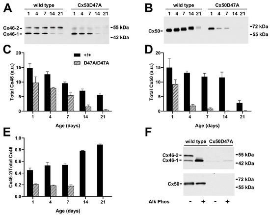 Immunoblot detection and quantification of Cx46 and Cx50 at various post-natal ages in wild-type and Cx50D47A mice. (A,B) Immunoblots of Cx46 (A) and Cx50 (B) in lens homogenates from 1-, 4-, 7-, 14-, and 21-day-old wild-type and homozygous Cx50D47A mice (C3H background). The two major Cx46 bands are indicated as Cx46-1 and Cx46-2. The migration positions of the molecular mass markers are indicated on the right. (C,D) Graphs show the mean (bar) + SEM of the densitometric values of the immunoreactive Cx46 bands (C) and Cx50 bands (D) obtained from three independent experiments expressed in arbitrary units (a.u.). (E) Graph shows the mean (bar) + SEM of the ratio of Cx46-2 to total Cx46 from densitometric analysis of three independent experiments. (F) Immunoblot detection of Cx46 (upper panel) and Cx50 (lower panel) in homogenates from the lenses of 7-day-old wild-type or homozygous Cx50D47A mice after incubation in the absence or presence of alkaline phosphatase (Alk Phos). The two major Cx46 bands are indicated as Cx46-1 and Cx46-2. The migration positions of the molecular mass markers are indicated on the right.