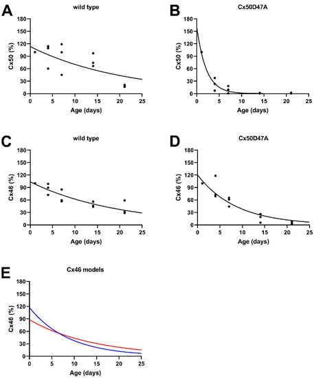 3.6. Exponential Decay of Cx46 and Cx50 Levels in Lenses of Wild-Type and Cx50D47A Mice