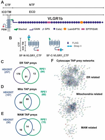 VLGR1 protein domain composition, VLGR1_CTF constructs for TAPs and overlap of proteins associated to ER, mitochondria and MAM identified in VLGR1_CTF TAPs. (A) VLGR1 protein domain composition: VLGR1 molecules consist of a C-terminal fragment (CTF) and a N-terminal fragment (NTF) which result from the cleavage at the highly conserved GPCR proteolytic site (GPS) in the GAIN (autoproteolysis-inducing) domain positioned next to the seven-span transmembrane domain (TM). After autoproteolytic cleavage the first 11 amino acids of VLGR1_CTF, the so-called Stachel peptide, can act as a tethered internal agonist for receptor activation []. The extracellular domain (ECD) of VLGR1b contains numerous Ca2+ binding calcium exchanger β motifs (Calx-β), seven epilepsy-associated/Epitemptin-like (EAR/EPTP) repeats and a pentaxin/laminin G-like domain (LamG/PTX). The intracellular domain (ICD) ends with a class-1 PDZ binding motif (PBM). (B) VLGR1_CTF, N- or C-terminal tagged with Strep II/FLAG (SF)-tag used as baits in TAPs. (C) Venn diagram shows an overlap of 81 proteins of ER-related TAP prey for polled VLGR1_CTF N-and C-terminal tagged TAPs from HEK293T and hTERT-RPE1 cells. (D) Mitochondria-related prey proteins from VLGR1_CTF N-and C-terminal tagged TAPs in HEK293T and hTERT-RPE1 cells, compared in a Venn diagram with an overlap of 69 proteins. (E) 14 common MAM prey proteins are identified in TAPs from HEK293T and hTERT-RPE1 cells. (F) Protein networks of ER, mitochondria and MAM-related proteins, illustrated by Cytoscape analysis of preys identified in VLGR1_CTF N-and C-terminal tagged TAPs.