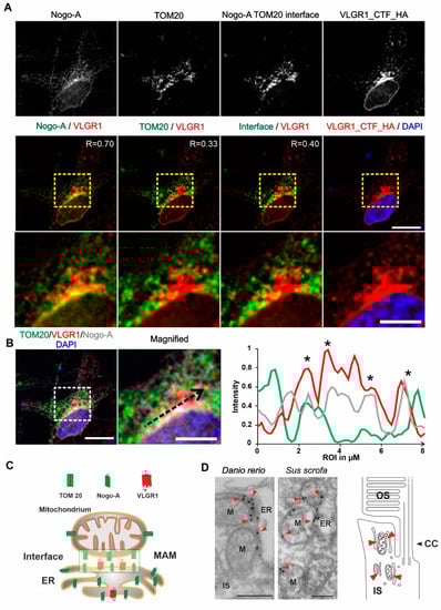 Next, we aimed to validate the presence of VLGR1 in the MAM compartment by immunocytochemistry. For this, we immunostained the ER-resident protein Nogo-A/RTN4 and the outer mitochondrial membrane protein TOM20 which were both present in the VLGR1_CTF TAPs as prey, in HeLa cells expressing VLGR1_CTF_HA (Figure 3A). Immunofluorescence microscopy showed the co-staining of VLGR1 with the ER marker Nogo-A, confirmed by a positive Pearson correlation coefficient value (R = 0.70) and an overlapping staining with the outer mitochondrial membrane marker TOM20 with a positive but lower Pearson correlation coefficient (R = 0.33). Next, we determined the localization of the ER-mitochondria interface in HeLa cells by applying the “subtract function” tool in Adobe Photoshop® subtracting the immunofluorescences signal of TOM20 and Nogo-A (Figure 3A). Merging the immunofluorescence of VLGR1 with the fluorescence subtraction result revealed the co-localization of VLGR1 with the ER-mitochondrial interface, which was also confirmed by the Pearson correlation coefficient (R = 0.40). The higher magnification of the zoom-ins of the merged images (Figure 3A, bottom panel) and the common peaks in the fluorescence intensity plots of the three channels of the region of interest (Figure 3B) further support these results. These findings indicate that VLGR1 is localized in ER membranes associated with ER-mitochondria interface of the MAM compartment illustrated in Figure 3C. The localization of VLGR1 at the interface of MAMs was confirmed by immunoelectron microscopy in sections through the inner segments of retinal photoreceptor cells of two different vertebrate species, namely the domestic pig (Sus scrofa) and zebrafish (Danio rerio) (Figure 3D).
