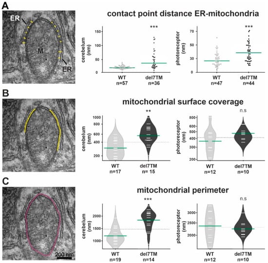 Furthermore, we morphometrically analyzed two additional structural parameters of MAMs, namely the mitochondrial surface coverage by the ER and the mitochondrial perimeter in both cerebellar neurons and photoreceptor cells (Figure 4B,C and Figure S4B,C). While the mitochondrial surface coverage by the ER was increased in both types of neurons, the mitochondrial perimeter was only increased in cerebellar neurons and not in photoreceptor cells of Vlgr1del7TM mice when compared to wild-type controls.