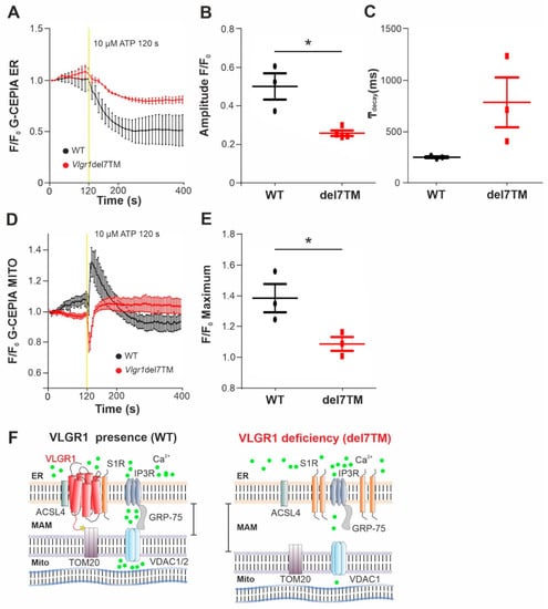 The MAMs represent a critical platform for the Ca2+ transfer from ER to mitochondria [,]. To monitor the Ca2+ flux in the two organelles, we made use of genetically encoded Ca2+ indicators targeted to ER, (G-CEPIA1er) and mitochondria (CEPIA2mt) []. We previously showed that primary astrocytes from mouse brain are well suited for studies of VLGR1 in cells [,]. Both Ca2+ indicators were transfected into primary brain astrocytes, derived from Vlgr1del7TM or wild-type control mice. To trigger the release of Ca2+ from the ER and to promote the mitochondrial Ca2+ uptake at the ER-mitochondria interface, we applied adenosine triphosphate (ATP) to the culture medium of the astrocytes. ATP stimulates purinergic receptor P2Y receptors, which activate phospholipase C (PLC), leading to hydrolysis of phosphatidylinositol 4,5-bisphosphate (PIP2) to diacylglycerol (DAG) and inositol triphosphate (IP3). Binding of IP3 to IP3 receptor (IP3R) on the ER membrane triggers the release of Ca2+ from the ER [,]. We monitored the dynamics of Ca2+ fluxes in the ER and the mitochondria in response to ATP in G-CEPIA1er- and CEPIA2mt-expressing astrocytes of Vlgr1del7TM and WT by live-cell imaging (Figure 5 and Figure S5A). We quantified the time course of Ca2+ release from the ER (Figure 5A) by calculating the amplitude and the kinetics of the G-CEPIA1er signal, respectively (Figure 5B,C). The experiments showed significantly decreased Ca2+ release from the ER (Figure 5B), which was accompanied by an almost significant slowing of Ca2+ efflux in Vlgr1del7 TM astrocytes compared with wild-type control astrocytes (Figure 5C). Further, the measurement of CEPIA2mt signals showed a significant decrease of mitochondrial Ca2+ uptake in Vlgr1del7TM astrocytes (Figure 5D,E and Figure S5B). In conclusion, our data demonstrate that VLGR1 is necessary for the proper regulation of Ca2+ homeostasis at MAMs and absence of VLGR1 results in dysregulated Ca2+ homeostasis at MAMs, as illustrated in Figure 5F.