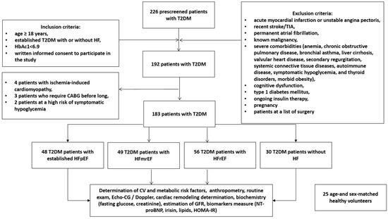 A total of 183 participants with T2DM aged 41 to 62 years (30 non-HF patients and 153 HF patients) were prospectively recruited for the study from October 2020 to December 2021. The T2DM patients were treated in the private hospital Vita-Centre (Zaporozhye, Ukraine). The healthy control group consisted of 25 individuals matched with age and sex to all other groups of patients. The following inclusion criteria were used: age ≥ 18 years, established T2DM with or without HF, adequate control for hyperglycemia (HbAc1 < 6.9%), written consent to participate in the study. Exclusion criteria were acute myocardial infarction or unstable angina pectoris, recent stroke/transient ischemic attack (TIA), permanent atrial fibrillation, known malignancy, severe comorbidities (anemia, chronic obstructive lung disease, bronchial asthma, liver cirrhosis, known valvular heart disease, symptomatic hypoglycemia, morbid obesity, congenital heart disease, systemic connective tissue diseases, autoimmune disease, cognitive dysfunction and thyroid disorders), type 1 diabetes mellitus, ongoing insulin therapy and pregnancy. All healthy participants had no history of CV disease. Figure 1 illustrates the flow chart of the study design.