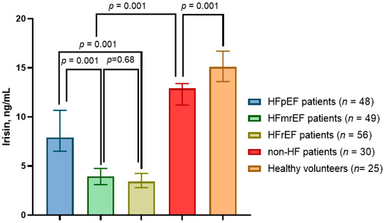 The levels of irisin were significantly higher in HFpEF patients than in HFrEF individuals (7.90 ng/mL; 95% CI = 6.85–10.66 ng/mL vs. 3.41 ng/mL; 95% CI = 2.80–4.24 ng/mL, p = 0.001) and were also higher than in HFmrEF patients (3.95 ng/mL; 95% CI = 3.10–4.75 ng/mL, p = 0.001), whereas non-HF T2DM patients (12.9 ng/mL; 95% CI = 11.2–13.4 ng/mL) demonstrated lower levels of irisin when compared to healthy volunteers (15.1 ng/mL; 95% CI = 13.6–16.7 ng/mL; p = 0.001) (Figure 2).