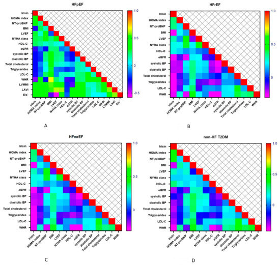 Heat map plots comparing serum levels of irisin with other variables in different cohorts of patients with T2DM. (A): Heat map for HFpEF; (B): Heat map for HFrEF; (C): Heat map for HFmrEF; (D): Heat map for non-HF T2DM. Abbreviations: BMI, body mass index; BP, blood pressure; eGFR, estimated glomerular filtration rate; LDL-C, low-density lipoprotein cholesterol; HDL-C, high-density lipoprotein cholesterol; HF, heart failure; HOMA-IR, Homeostatic Assessment Model of Insulin Resistance; HFpEF, heart failure with preserved ejection fraction; HFmrEF, heart failure with mildly reduced ejection fraction; HFrEF, heart failure with reduced ejection fraction; LVEF, left ventricular ejection fraction; NT-proBNP, N-terminal brain natriuretic pro-peptide; NYHA, New York Heart Association; T2DM, type 2 diabetes mellitus; WHR, waist-to-hip ratio.