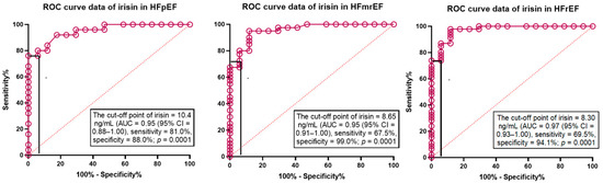 The predictive models based on the serum levels of irisin for different phenotypes of HF: The results of the ROC curve analysis. Abbreviations: AUC, area under curve; CI, confidence interval; HFpEF, heart failure with preserved ejection fraction; HFmrEF, heart failure with mildly reduced ejection fraction; HFrEF, heart failure with reduced ejection fraction.