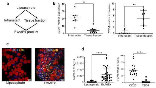 Generation of the ExAdEx model and its main characteristics. (a) A schema of the ExAdEx process. Cells were isolated from the infranatant of the lipoaspirates and then mixed with the tissue fraction previously dissociated mechanically. (b) CD26 and CD54 gene expression in the infranatant and the tissue fraction; n = 8 donors. (c) The ExAdEx process promotes cell proliferation. The lipoaspirate or the emulsified product after 14 days in culture was incubated with EdU for 24 h. Then the EdU click-iT-labeling of the EdU incorporated into cells was performed and confocal imaged. Red: ORO for lipid droplets; Yellow: Edu-labeled nuclei. Blue: DAPI for nuclei. Scale bar: 100 μm. (d) Expansion of APC subpopulations. The number of total APCs was quantified from 100 mg of lipoaspirate and from the derived ExAdEx model maintained for 14 days in culture; n = 27 donors (left panel). Then, the percentage of CD26+/CD54− and CD54+/CD26− APCs was quantified by FACS analysis; n = 15 donors (right panel). ** p ≤ 0.01; **** p ≤ 0.001.