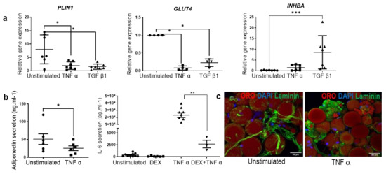 Generation of the ExAdEx inflamed-like model. (a) Regulation of PLIN1, GLUT4 and INHBA gene expression in ExAdEx–TNFα and ExAdEx–TGFβ1 models. (b) Levels of adiponectin secretions. One hundred mg of ExAdEx was maintained in vitro for 30 days and then treated or not with 10 ng/mL TNFα for 7 days. Levels of secretion during the last 24 h of the treatment were determined by ELISA; n = 6 donors. Levels of IL6 secretions. One hundred mg of ExAdEx was maintained in vitro for 30 days and then treated or not with 0.25 μM dexamethasone or 10 ng/mL TNFα or both for 7 days. Levels of secretion during the last 24 h of the treatment were determined by ELISA; n = 9 donors. * p ≤ 0.05; ** p ≤ 0.01; *** p ≤ 0.001 using the Mann–Whitney test. (c) The remodeling of the extracellular matrix in the inflamed ExAdEx model. The ExAdEx and ExAdEx-TNFα models were fixed and stained with anti-laminin antibodies and with ORO for lipid droplets.