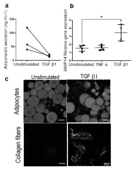 Generation of the ExAdEx fibrotic-like model. (a) Levels of secreted adiponectin. Ten mg of the ExAdEx model was treated with 5 ng/mL TGFβ1 for 7 days, and the levels of secretion during the last 24 h of the treatment were determined by ELISA; n = 3 donors. (b) The expression of the MMP14 gene determined by qPCR; n = 4 donors. * p ≤ 0.05. (c) The visualization of fibrotic collagen fibers by SHG imaging. Scale bar: 50 nm.